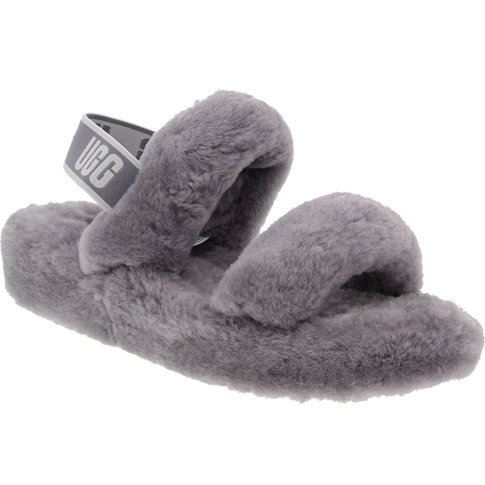 UGG Oh Yeah Slide Slippers – Womens. Add some fun flair to any outfit with these iconic womens slippers. Designed with a stylish elastic strap for warm-weather wear, the UGG Oh Yeah Slide Slippers are versatile for indoor or outdoor wear and bring a playful vibe to every ensemble. The soft sheepskin upper, lining, midsole and insole combine with a molded rubber outsole for maximum comfort and grip. The low heel provides extra support in every step.