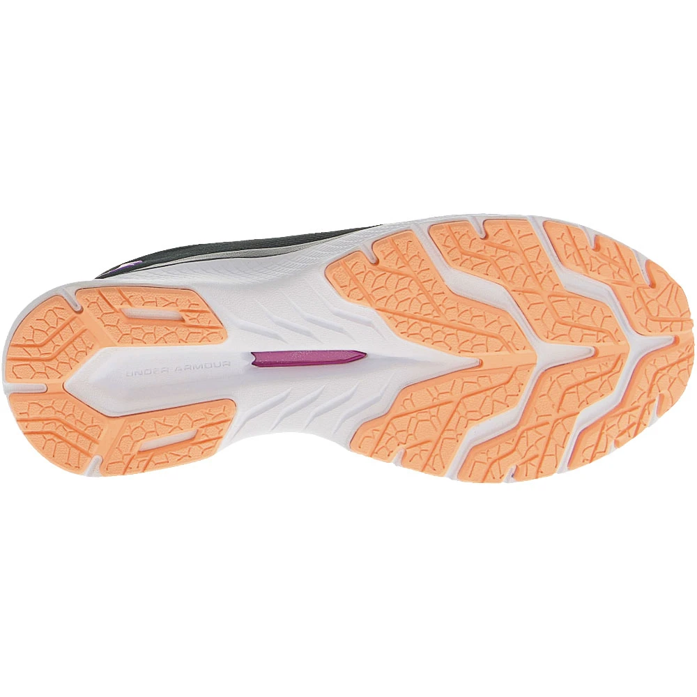 Under Armour Charged Bandit 6 Running Shoes – Womens. Let these lightweight womens running shoes support you for the long haul. The engineered mesh upper has a padded collar and tongue for a secure, cushioned fit. The midsole features a TPU shank for enhanced stability and Charged Cushioning technology for targeted softness and support. A molded full-length sockliner keeps you cushioned and comfortable while preventing slippage. The durable solid rubber outsole gives extra coverage to high-impact zones without added weight.