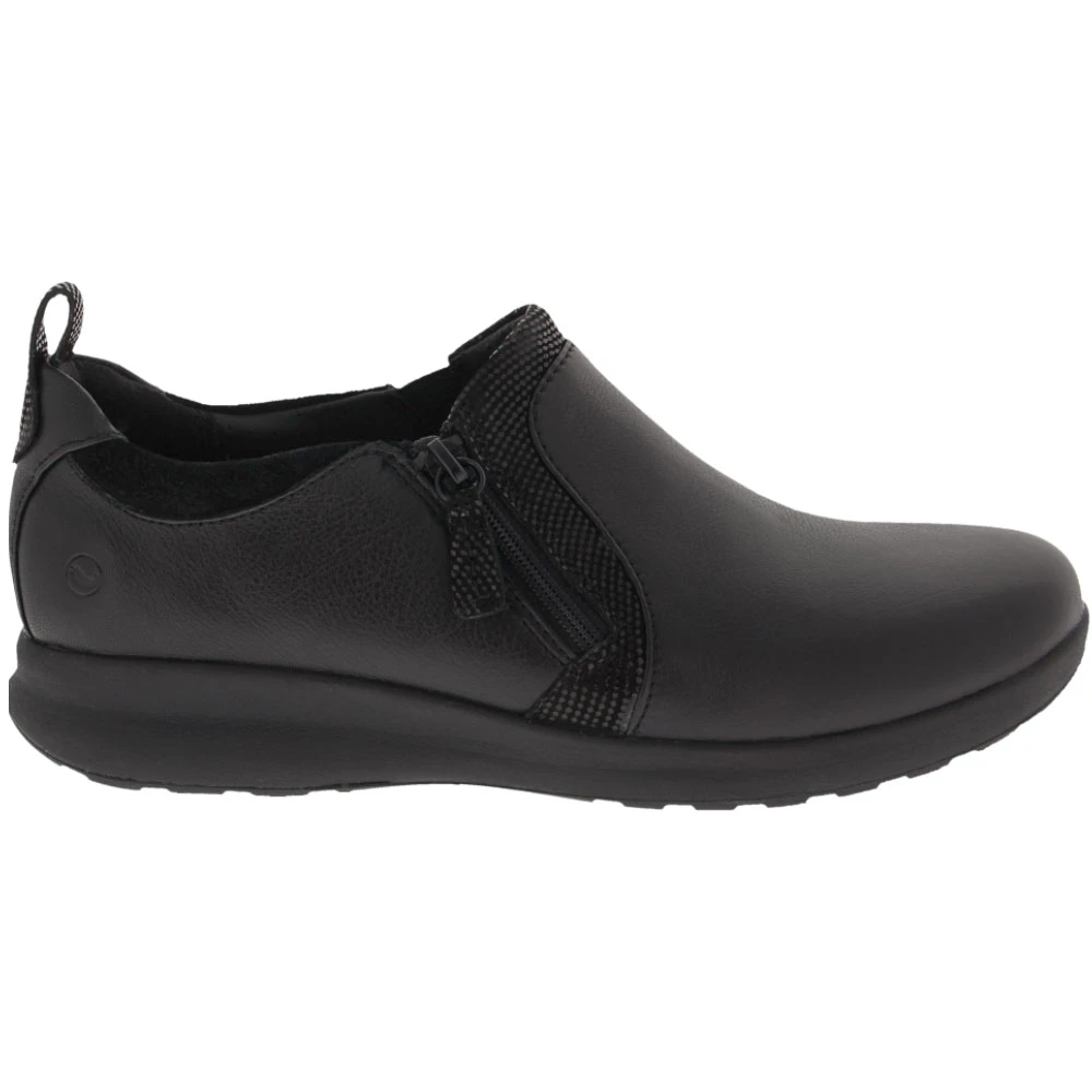 Unstructured by Clarks Adorn Zip Women’s Slip on Casual Shoes. Get the look of a classic, versatile shoe that feels like a favorite sneaker with these womens slip on casual shoe. Their simple, stylish upper features different materials to add a subtle visual appeal that makes them suitable for jeans or an everyday skirt or dress. They easily slip on and off thanks to a sleek side zipper. The heart of these shoes is their wearability. An EVA midsole and cushioned footbed keep you moving in comfort all day.
